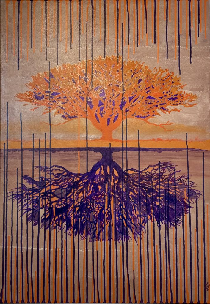 Réflexion sur la résilience profonde de la nature, qui trouve toujours sa voie, qui survit et se développe en s’adaptant sans cesse alors même qu’elle subit de plein fouet les contraintes des hommes et les ravages de ses constructions, de ses pollutions. Un contraste fort se créée entre les racines, les feuilles, les arbres et les formes organiques du monde végétal et les lignes droites, les formes rigides et stériles de la société humaine. La nature évolue et survit. Cette toile évoque pour moi l’arbre qui résiste aux pluies acides et polluantes, qui l’enferment dans un cadre difficile. Toujours là, l’arbre est mutant, ses couleurs en deviennent surnaturelles. La Savane au coucher du soleil, un mirage visuel créé par la chaleur.